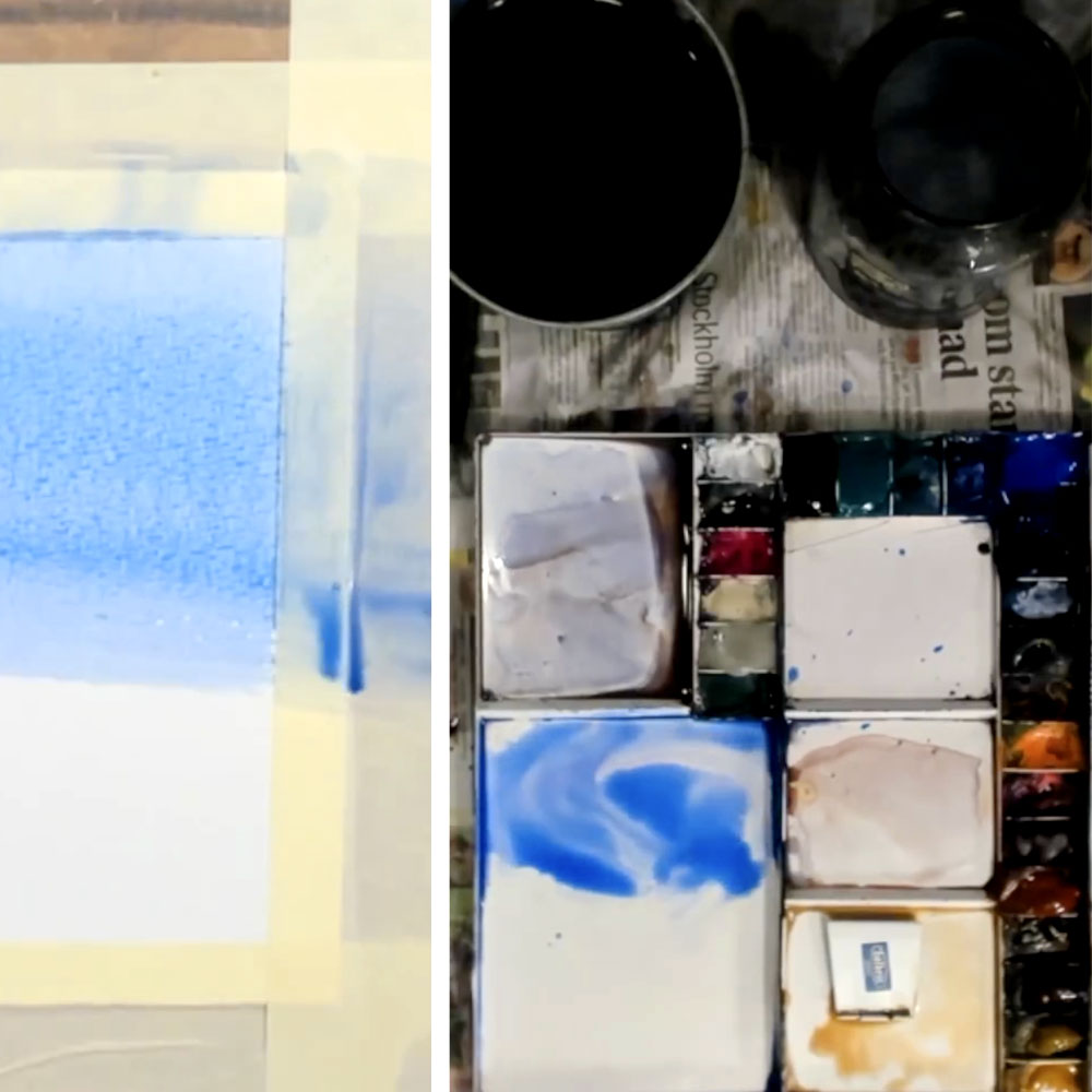 | Kursplan: Vill du lära dig måla himlar på fler sätt så visar jag fem sätt i lektionen. I Varje del visar jag dig tips på hur du kan hantera dina penslar och utöka din kontroll på vatten, pigment och olika fuktigheter på akvarellpappret |